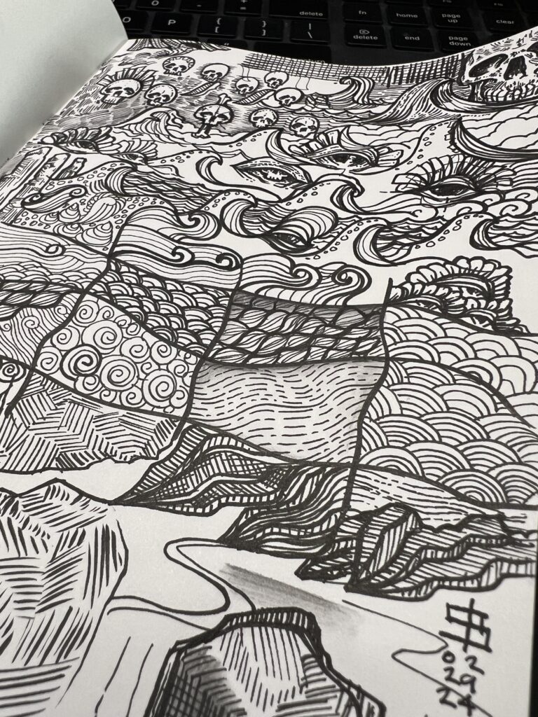 Sometimes it’s not about something specific… but rather a way to clear out the rush of noise that hits your brain. This helps me when my mind is rattled and I can’t calm it down. I pick up the pen and just doodle endlessly… some things make sense other’s don’t… and I don’t f’en care! It just feels good to let it all go.
